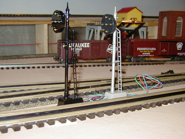 I've also successfully removed the heads from the MTH signals and mounted them to a Plasticville Signal Bridge. Lucky for me, the Plasticville bridge is based on a PRR prototype! More recently, I've used the electronics and signal heads from the MTH Pennsy signal bridge on my Plasticville bridges. The MTH bridge is diecast and much too "heavy" looking, but the signal heads on that bridge are closer to scale size than the earlier MTH trackside signals. The signal detection circuits are wired using relays. The next website update will describe this process and have more photos.